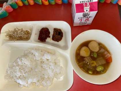 今日の給食は、鯨のオーロラ煮、丸天と野菜のうま煮、もやしのピリ辛和えです。