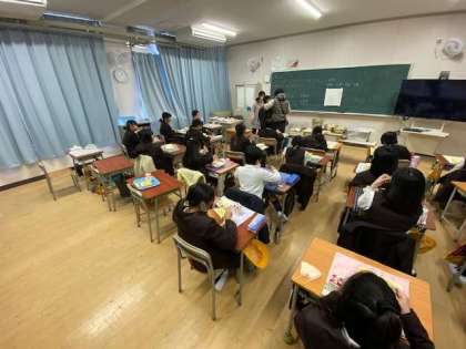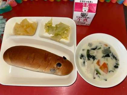 今日の給食は、ほうれん草のクリームシチュー、キャベツのサラダ、洋梨です。パンはレーズンパンです。