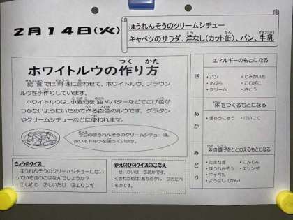 ほうれん草には、ミネラルやビタミンがたくさん含まれているバランスの良い食材です。温かいシチューの中に入ったほうれん草をしっかり食べてください。