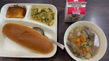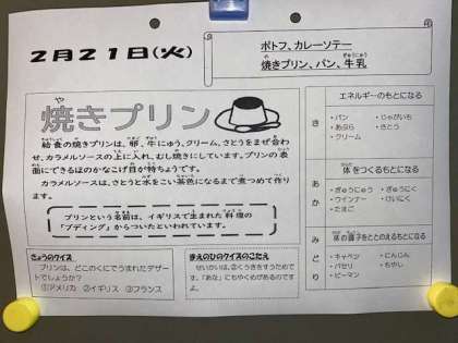 今日の給食は、ポトフ、カレーソテー、焼きプリンです。