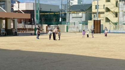 運動場では、いきいきの活動が行われています。元気にボール遊びをしています。