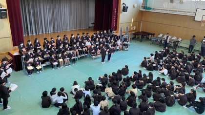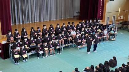 6年生から在校生には、6年生の代表者が在校生にメッセージを送ります。その後、ルパン3世のテーマ曲を演奏しました。