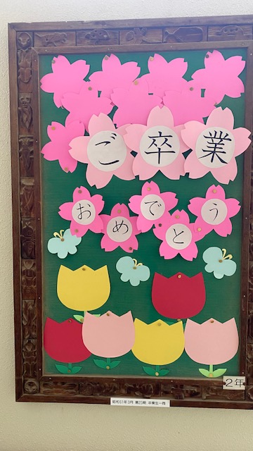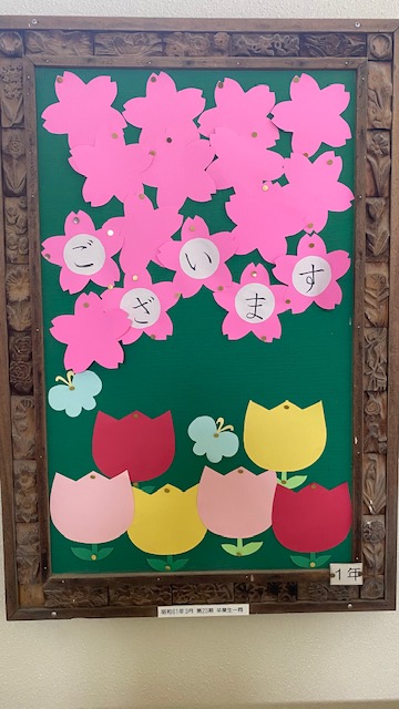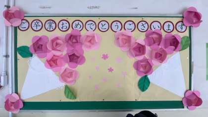 廊下にある掲示板には、きれいなお花が咲いています。