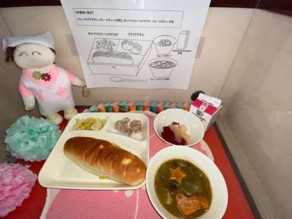 今日の給食は、フライドチキン、カレーシチュー、キャベツとコーンのサラダ、フルーツゼリーです。パンはおさつパンです。