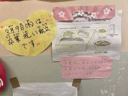 今日のメニューは「卒業お祝いメニュー」です。卒業まであと1週間ですね。小学校での給食も今日を含めあと6回になります。おいしく作るのでたくさん食べてね。