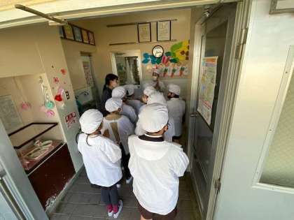 今日の給食は、豚肉の生姜焼き、サツマイモの味噌汁、菜の花のおひたしです。