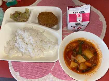 今日の給食は、チキンレバーカツ、ケチャップ煮、ツナとキャベツのバジルソテーです。