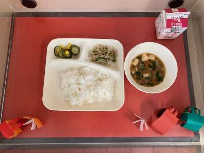 今日の献立は、マーボーどうふ、きゅうりとコーンの甘酢あえ、もやしとピーマンのごまいためです。