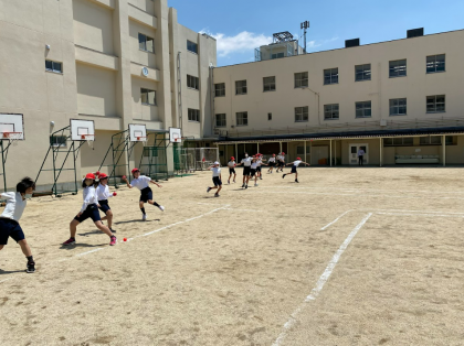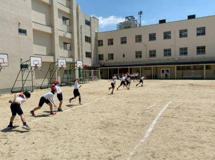 体力測定に向けて運動場でソフトボール投げをしました。