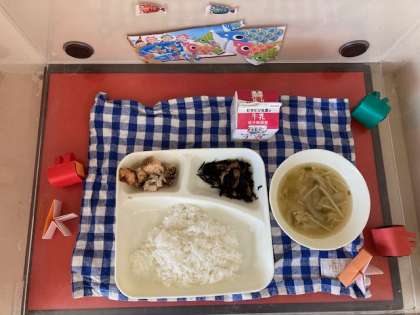 今日の献立は、さけのごまみそ焼き、五目汁、