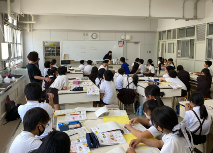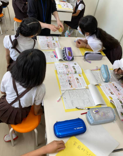 家庭科室にて、石原先生から家庭科室の使い方と調理自習を行う際の説明がありました。先生が実際にホウレンソウや卵を湯がく様子を子どもたちに披露すると、子どもたちは興味津々に見入っていました。