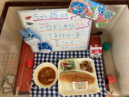 今日の献立は、一口トンカツ、ミネストローネ、豆こんぶです。