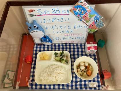 今日の献立は、八宝菜、チンゲンサイともやしのしょうがあえ、パインアップルです。