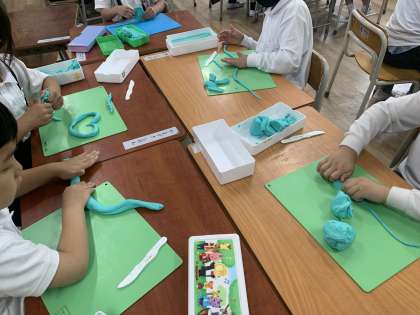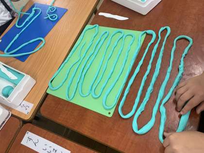 てのひらやゆびさきでねんどをひものようにへんかさせたよ!