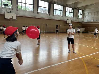 風船を使って、チームでフォームを確認しながらパスの練習をしました。