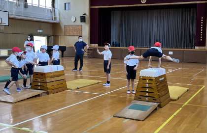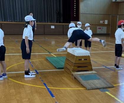 「手をもっと前についたらいいよ!」など、班のメンバーでアドバイスを送りながら、きれいに跳ぶことを目標に練習をしています。