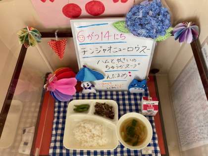 今日の献立は、チンジャオニューロウスー、ハムと野菜の中華スープ、えだまめです。