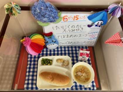 今日の献立は、鶏肉のカレー風味焼き、てぼ豆のスープ、さんどまめとコーンのサラダです。