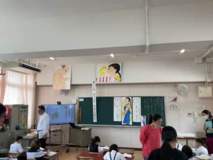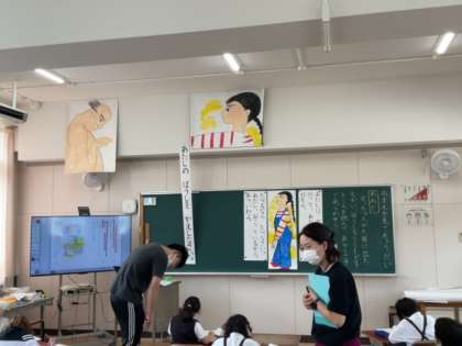 国語科『名前を見てちょうだい』の学習をしました。えっちゃんの気持ちを考えて音読し、大きくなったえっちゃんの気持ちを読み取り、ノートに書きました。最後に、えっちゃんと大男になりきって、言い方や動きを工夫しながら役柄を演じました。