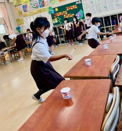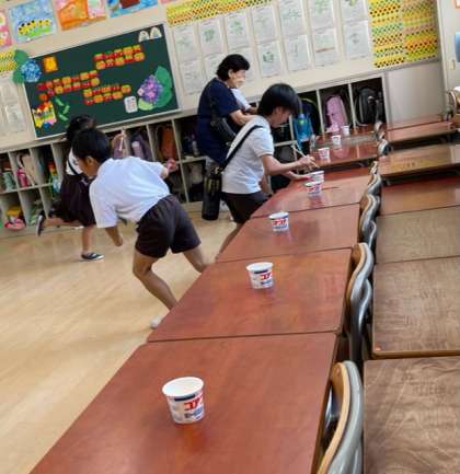 わりばしをうまく使って、どんぐりなどを挟んで運びます。