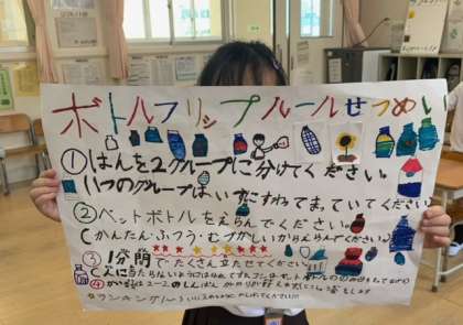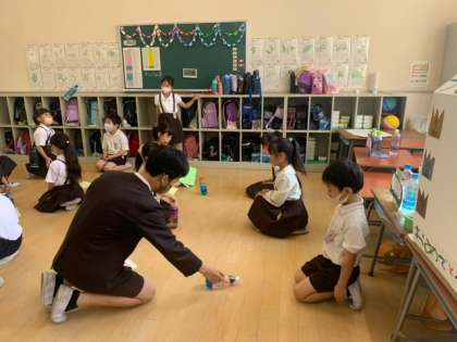 2年2組では、ボトルフリップのお店屋さんをしました。