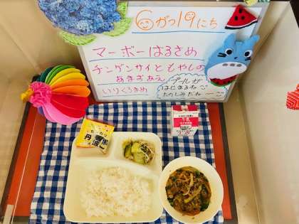 今日の献立は、マーボーはるさめ、チンゲンサイともやしの甘酢あえ、いり黒豆です。