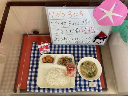 今日の献立は、ゴーヤチャンプルー、五目汁、あつあげのしょうがじょうゆかけです。