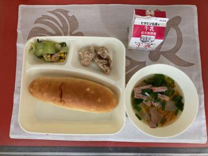 今日の献立は、鶏肉のからあげ、とうがんの中華スープ、ツナとチンゲンサイのいためものです。