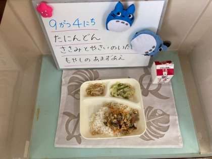 今日の献立は、他人丼、ささみと野菜のいためもの、もやしの甘酢あえです。