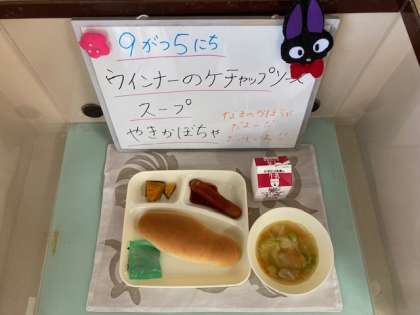 今日の献立は、ウインナーのケチャップソース、スープ、焼きかぼちゃです。