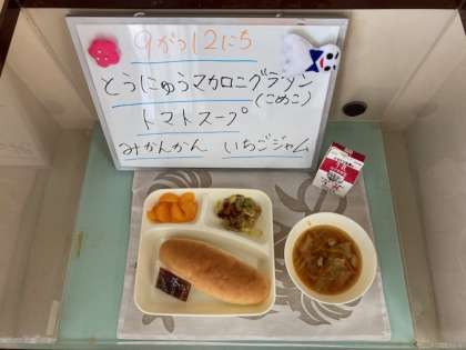 今日の献立は、豆乳マカロニグラタン、トマトスープ、みかんです。