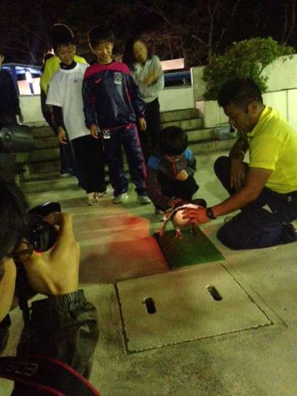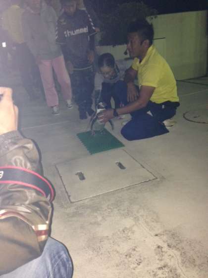夕食後、志摩マリンランドへ行き、ふれあい体験に取り組んでいます。ペンギンとのふれあいです。