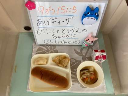 今日の献立は、あげぎょうざ、鶏肉ととうがんの中華煮、なしです。