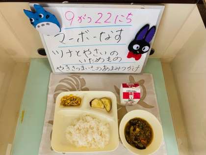 今日の献立は、マーボーなす、ツナと野菜のいためもの、焼きさつまいもの甘みつかけです。