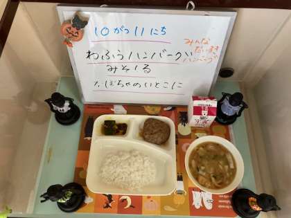 和風ハンバーグ、みそ汁、かぼちゃのいとこ煮です。