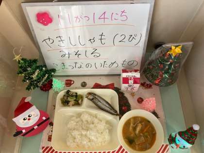 今日の献立は、焼きししゃも、みそ汁、こまつなのいためものです。