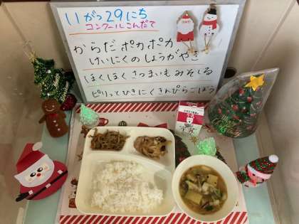 体ポカポカ鶏肉のしょうが焼き、ほくほくさつまいもみそ汁、ピリッとひき肉きんぴらごぼうです。