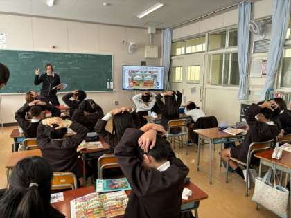 野菜や果物の英単語を使って、ミニゲームをして外国語活動を楽しんでいます。友だちとたくさん交流ができる外国語を毎回意欲的に取り組んでいます。