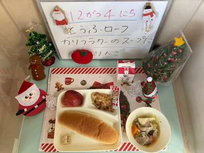 今日の献立は、とうふローフ、カリフラワーのスープ煮、りんごです。
