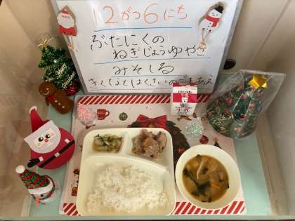 今日の献立は、豚肉のねぎじょうゆ焼き、みそ汁、きくなとはくさいのごまあえです。
