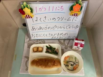 今日の献立は、はくさいのクリーム煮、あつあげのピリ辛じょうゆかけ、豚肉とさんどまめのオイスターソースいためです。