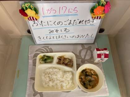 今日の献立は、豚肉のごまだれ焼き、みそ汁、きくなとはくさいのおひたしです。