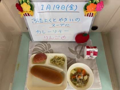 今日の献立は、豚肉の野菜のスープ煮、カレーソテー、りんごです。