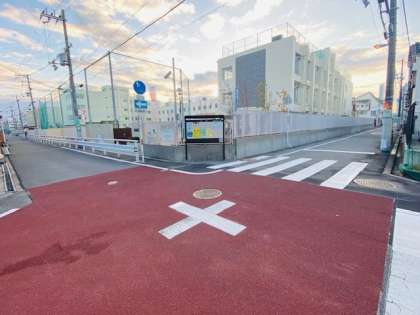この度、春日出小学校北東角と北西角の交差点について、通行する車両により一層注意を払って通行してもらえるように、カラー舗装化工事が完了しました。