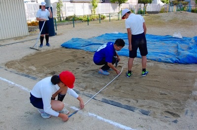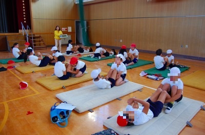 写真は、5・6年生の立ち幅とびと上体起こしの様子です。