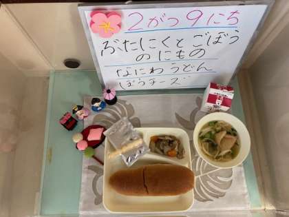 今日の献立は、豚肉とごぼうの煮もの、なにわうどん、棒チーズです。