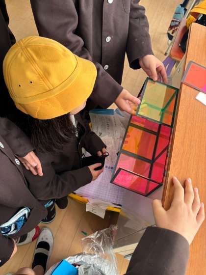 本日ご参観いただいた皆様、ありがとうございました。今年度最後の学習参観は、算数科「直方体と立方体」でした。面から箱を作ることを通して、直方体と立方体について学びました。実際に作った箱を確認しながら、辺の数や面の数、頂点の数を数え、立体の構成を理解することができました。休み時間には、面を組み立ててどんな形ができるかを試して楽しむ様子が見られました。