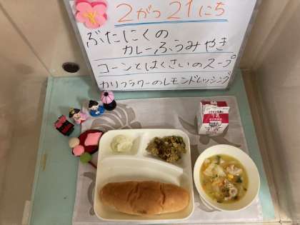 今日の献立は、豚肉のカレー風味焼き、コーンとはくさいのスープ、カリフラワーのレモンドレッシングです。