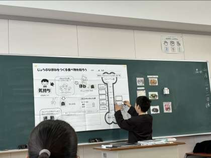 西九条小学校から栄養教諭の方に来ていただき、栄養指導をしていただきました。カルシウムの働きや、カルシウムの多く含まれた食材や給食メニューについて学習しました。あなうめクイズなどを楽しみながら、1日にどのくらい摂取すればよいかなどを学ぶことができました。