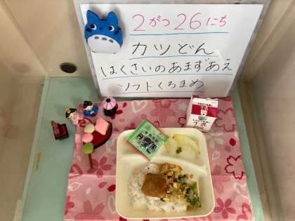 今日の献立表は、カツ丼、はくさいの甘酢あえ、ソフト黒豆です。